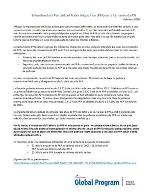 Este documento explica la tasa de conversión de PPA (paridad del poder adquisitivo), particularmente en términos de cómo se usa en la herramienta Índice de probabilidad de pobreza (PPI). Da una breve explicación de la PPA, así como también explica por qué la tasa de conversión de la PPA se usa sobre las tasas de cambio del mercado. Finalmente, explica cómo el PPI informa las tasas de pobreza, así como también explica por qué las comparaciones que usan el Tablero de PPI solo deben usarse dentro de los países y no entre países.